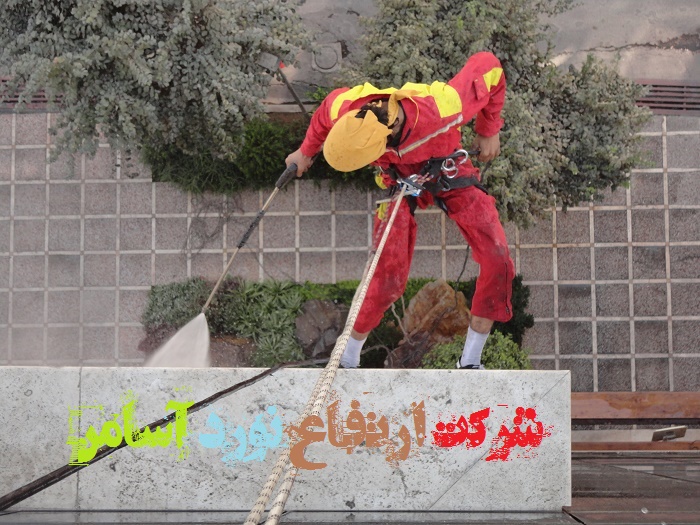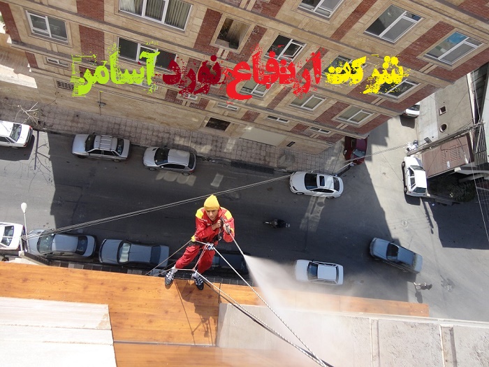 شستشوی کامل نمای ساختمان(شرکت ماهتاب گستر)- کار در ارتفاع