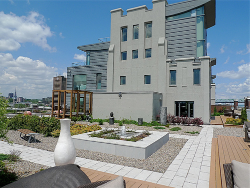 یکی از زیباترین بام باغ ها که بر روی سقف ساختمان L Heritage du vieux port است. این ساختمان درشهر مونترال کانادا قرار دارد و روبروی آن چشم اندازی از رودخانه. این خانه در حقیقت دارای پنج پنت هاوس با بالاخانه و فضاهای متفاوت است . این بام باغ از ویژگی های خاصی برخوردار است : یک تراس فراخ و باز که چشم انداز 360 درجه ای رو به شهر و رودخانه سنت لورنس را به نمایش می گذارد و سبب می شود این خانه واقعا خاص جلوه کند . خوشبختانه فضای لازم برای مبلمان و چیدمان صندلی های راحتی به خوبی طراحی شده است . کف باغ با سنگریزه فرش شده و دارای آلاچیق و بوته زارهای کوچک است . با وجود فضاهای باز ،این بام باغ ،سبکی جدیدی از زندگی را فراهم می کند که در مکان های شهری به ندرت دیده می شود .