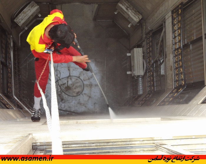 شستشوی نورگیر و پاسیو ساختمان بوسیله واتر جت - کار در ارتفاع